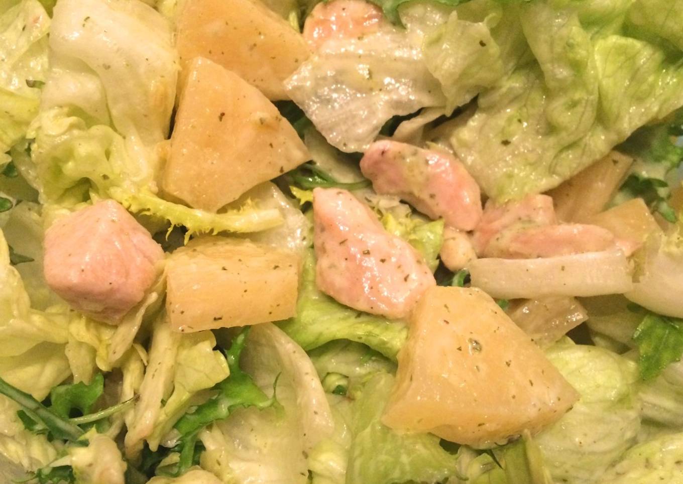 - Cortamos la piña en trocitos y la colocamos encima de la lechuga.