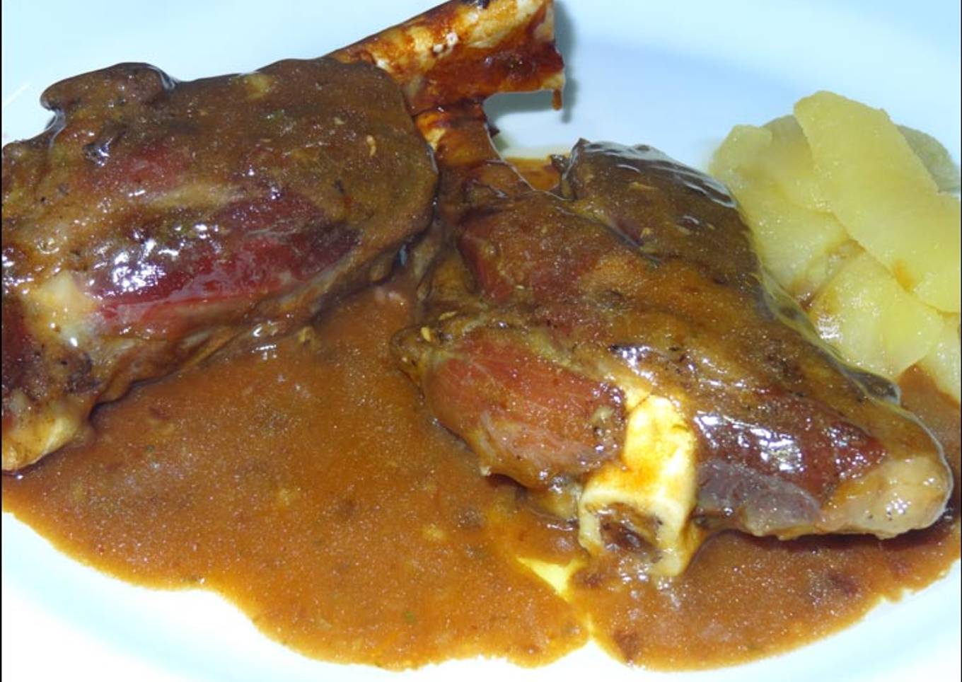 Codillos guisados en olla express con verduras y manzanas, se salsea con el fondo de cocción y se sirve con patatas fritas.