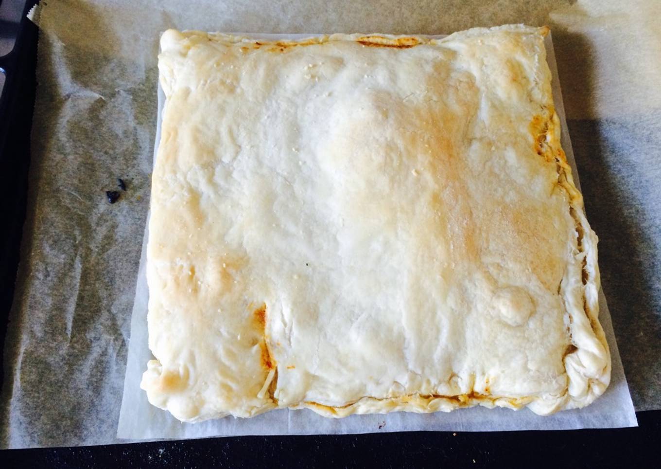 Cubrir con la segunda lámina y cerrar. - Metemos la empanada al horno según el tiempo que indique la caja de hojaldre. Suelen ser 15-20 minutos.