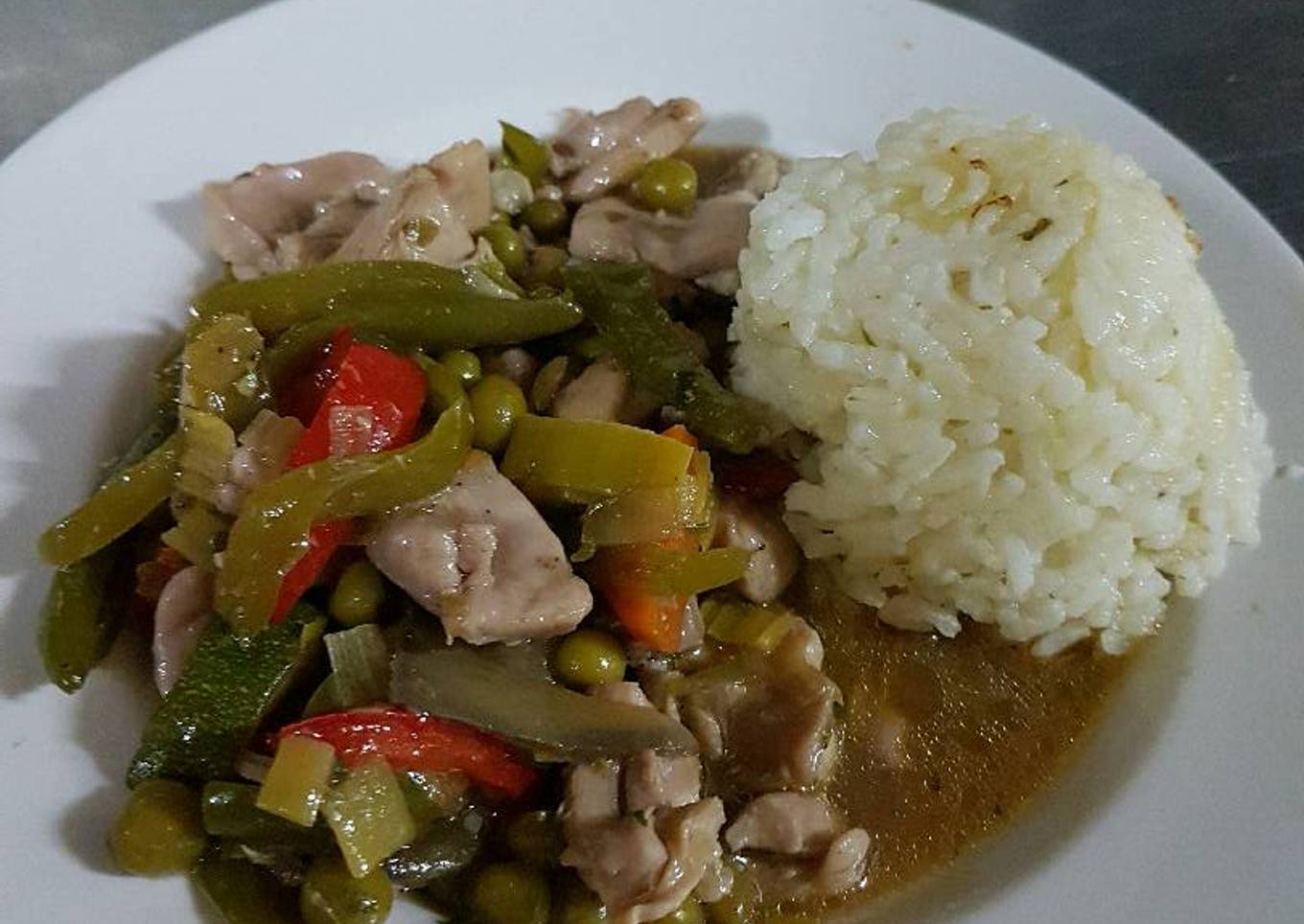 - Luego de saltear las verduritas agregarlas al pollo y servir con arroz o patatas fritas