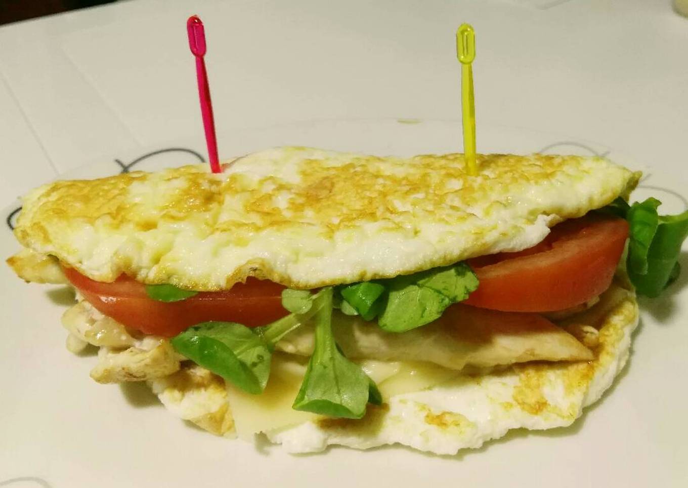 - Sobre la tortilla, colocar en la mitad de ella una base de canónigos, un par de rodajas de tomate, poner encima las pechugas y por último media loncha de queso.
