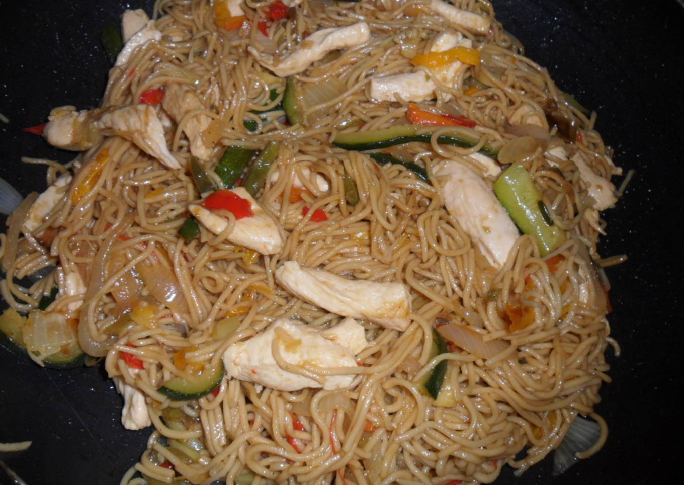 - Una vez escurridos los fideos los añadimos al sofrito de pollo y verduras.