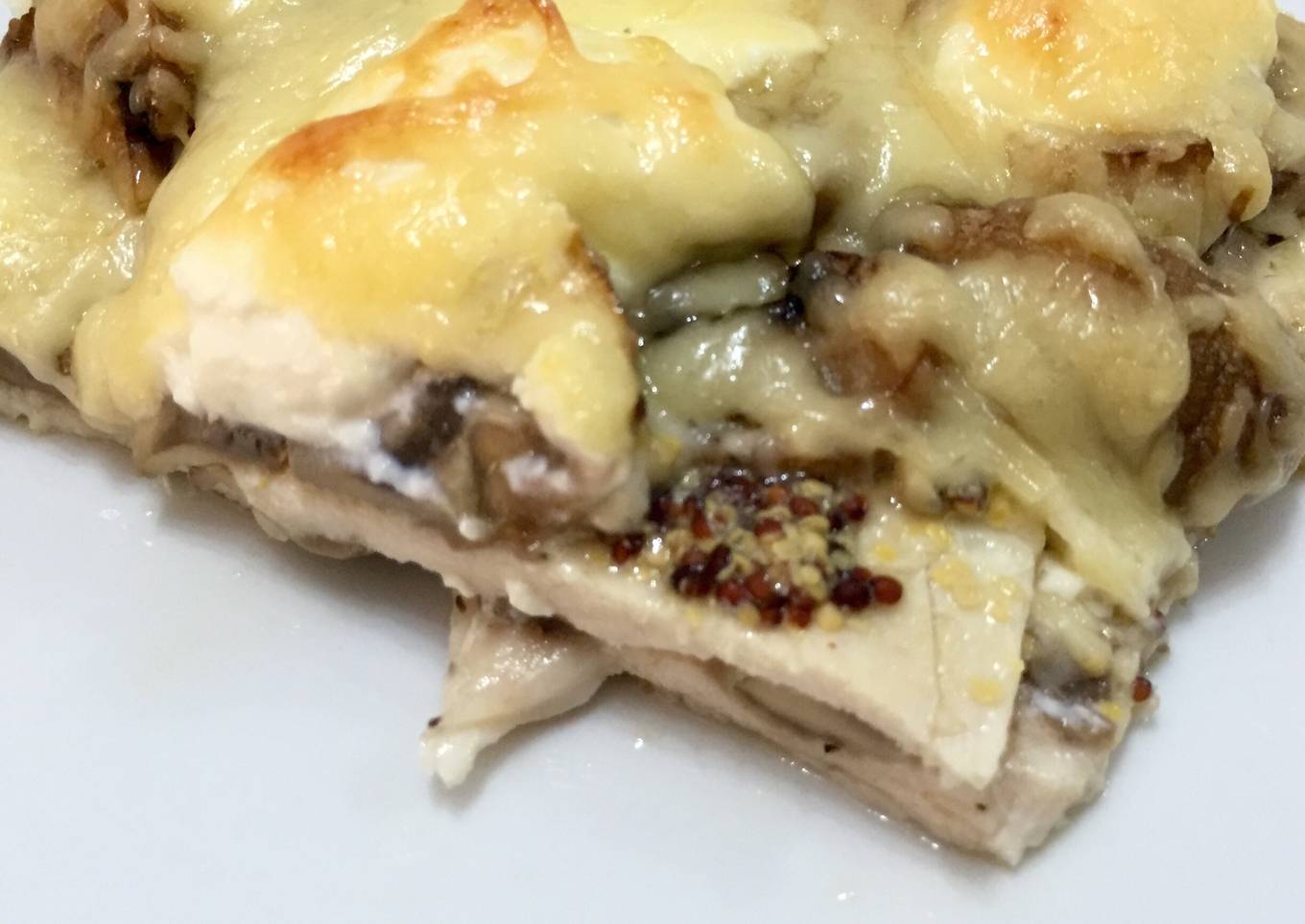 - Poner mostaza sobre las pechugas. Poner una capa de champiñones. Encima poner de manera aleatoria queso crema sobre los champiñones.