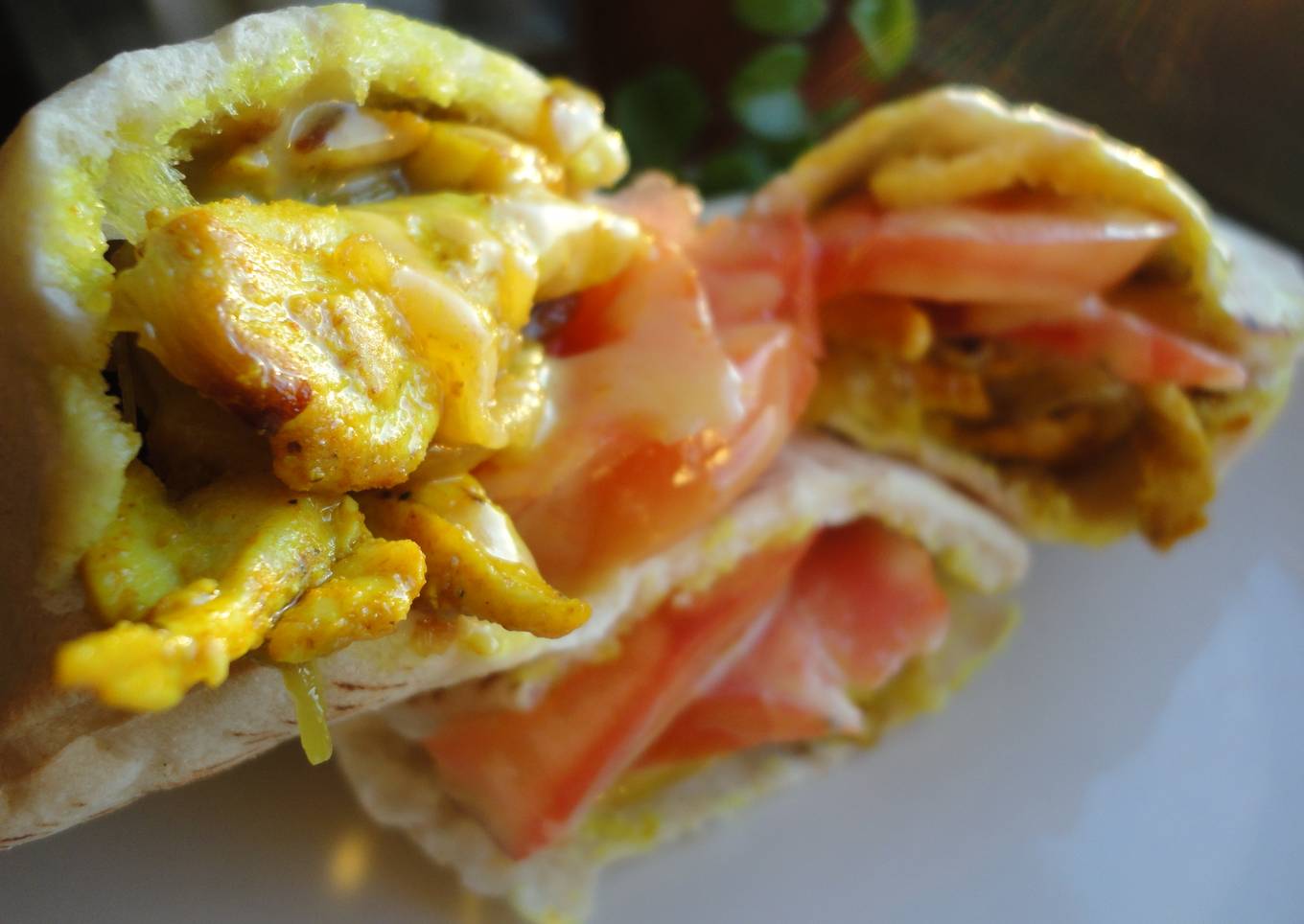 Panes pita rellenos de pollo marinado acompañado de unas rodajas de tomate fresco y una salsa sencilla de mostaza y miel.