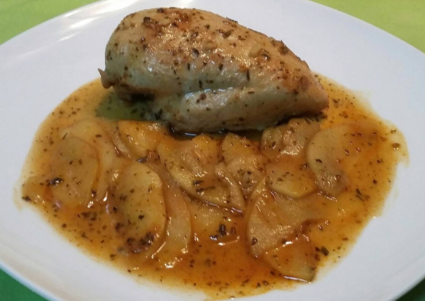 Sabrosa pechuga de pollo con una mezcla de hierbas que van en perfecta armonía con la manzana.