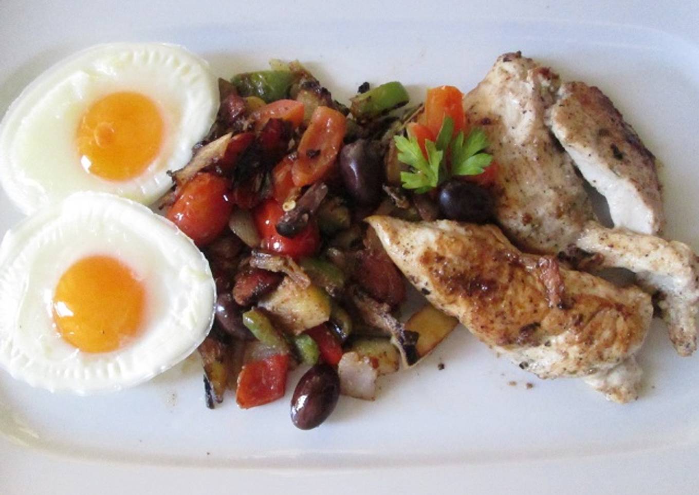 Huevos duros cocinados en moldecitos especiales de silicona acompañan estas ricas pechugas de pollo y verduras variadas cocidas a la sartén.