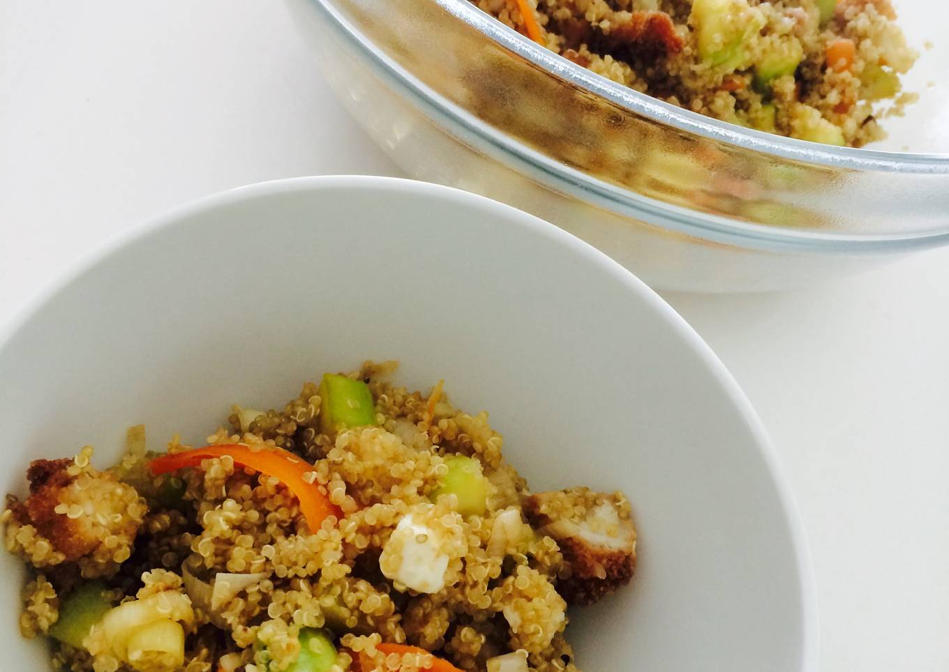 - Una vez que las verduras estén listas, en esa misma sartén añadimos la quinoa cocida, el pollo, el queso fresco y salsa de soja al gusto. Dejamos todos junto en el fuego unos 5 min.