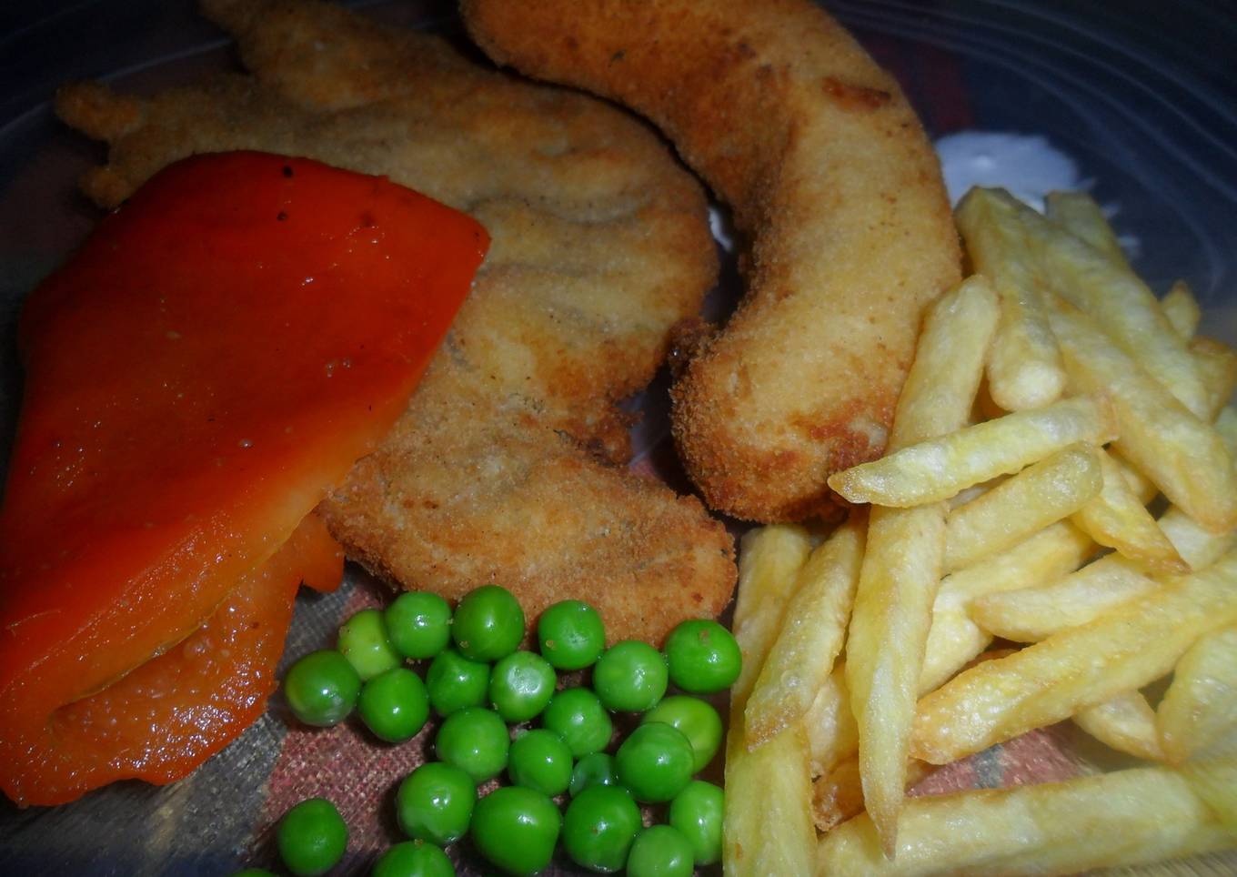 - Disponer las pechugas rebozadas en platos individuales (una en cada plato) acompañadas de un poco de patatas fritas, un plátano frito, una cucharada de guisantes previamente escurridos y salteados en una sartén con una cucharadita de mantequilla.