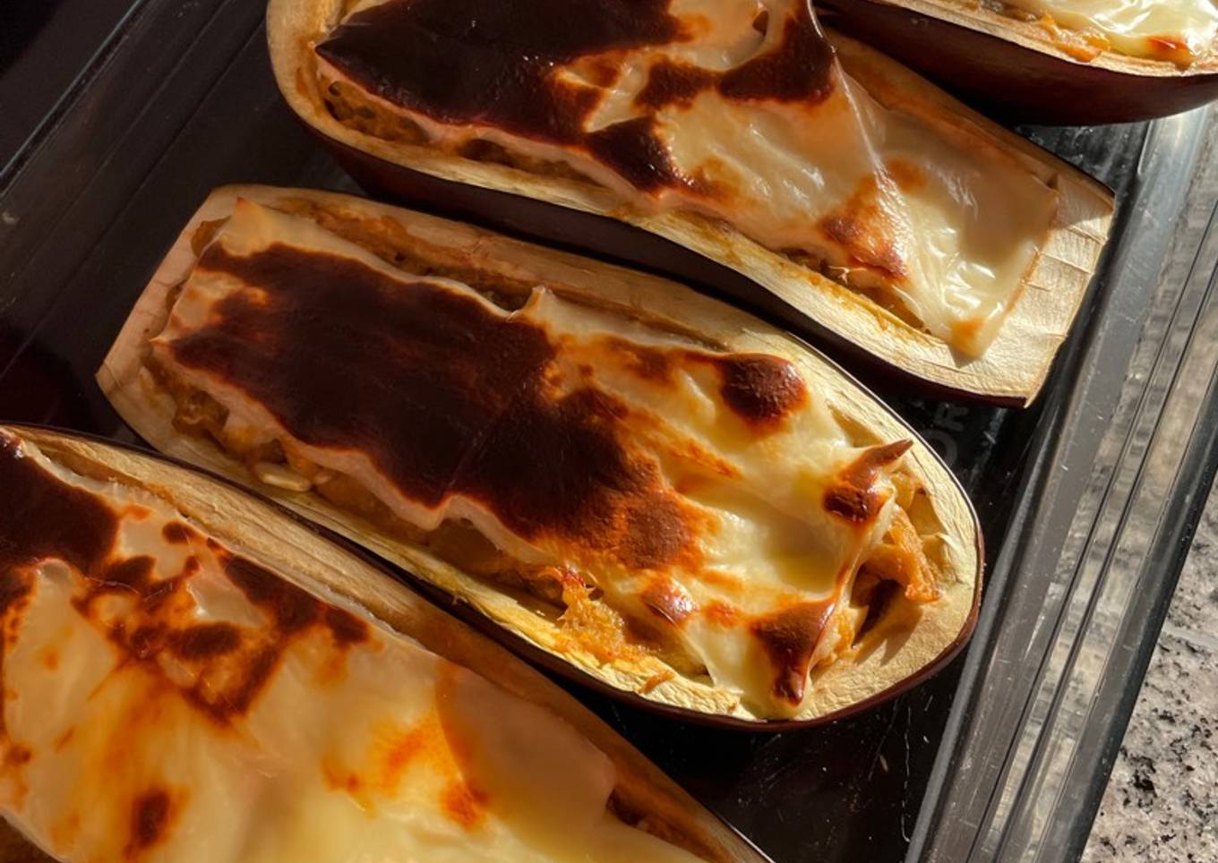 - Ponemos un chorrito de aceite en una fuente de horno. Colocamos las pieles de las berenjenas y las rellenamos. Cubrimos con el queso y gratinamos en el horno: unos 15-20 min. a 230º-250º, esto es aproximado pues depende de cada horno.