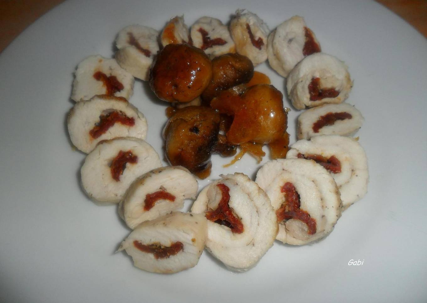 Los rollitos están elaborados con filetes de pollo rellenos de tomatitos secos. Los champiñones están salteados en aceite de oliva y bañados en caramelo.