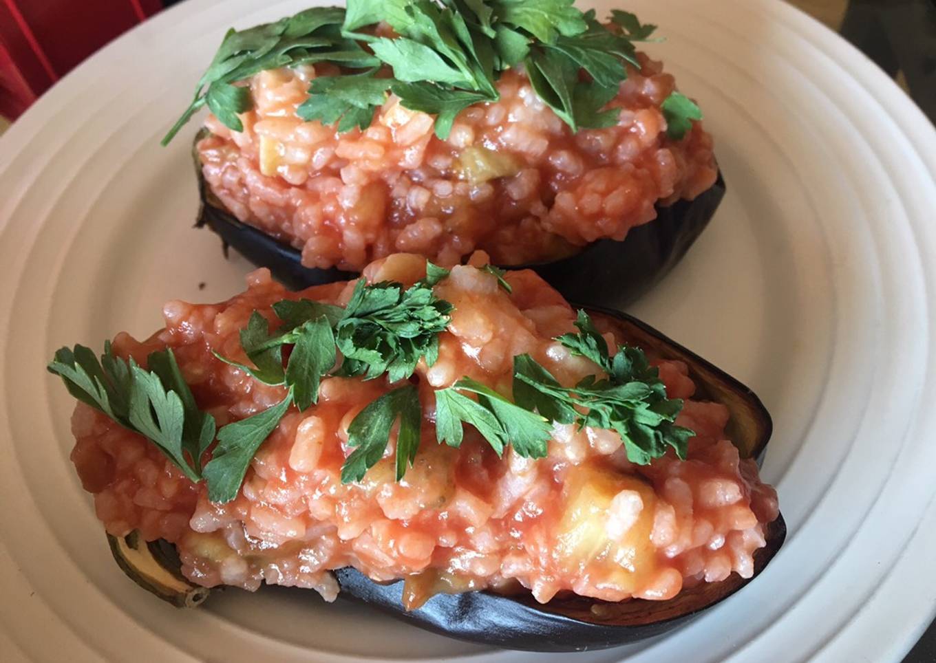 - Sofreír el ajo cortado en cubitos, añadir la berenjena, el arroz y darle un par de vueltas. Quitar del fuego y echar el tomate frito al gusto. Rellenar las berenjenas y decorar con perejil fresco.