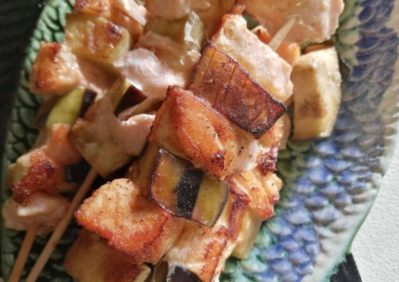 Brochetas de salmón y berenjenas con salsa de yogur