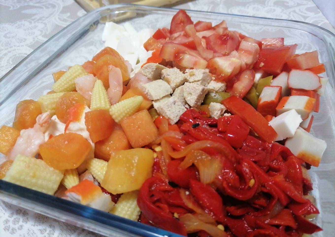 Esta es una nueve versión de ensalada de pimientos, acompañada de maíz, gambas, huevas de bacalao, tomate, queso burgos y bocas de mar. Salió una mezcla estupenda.