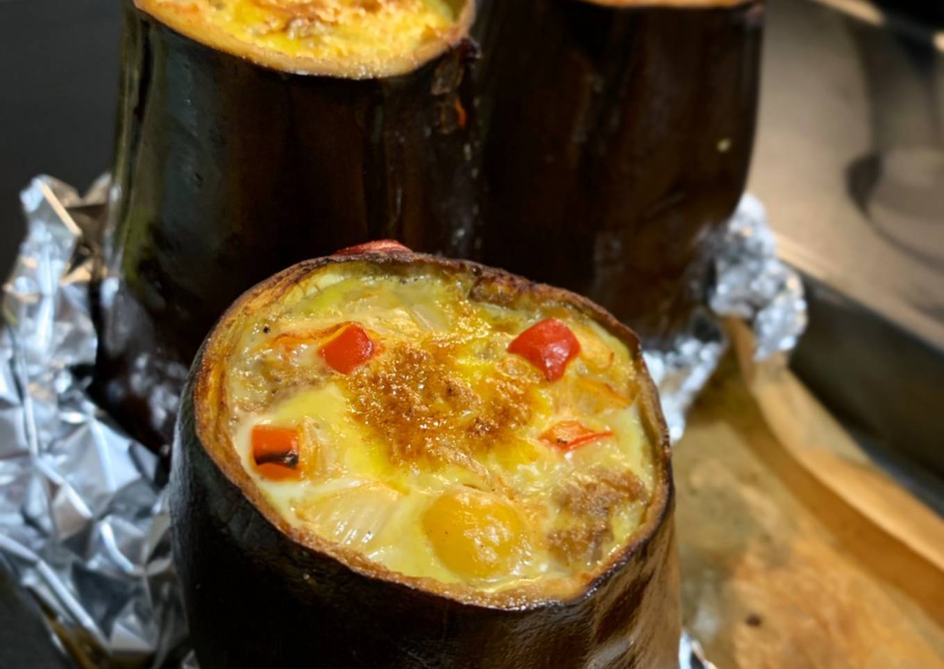 - 1. Cortar las puntas de las berenjenas 🍆, vaciarlas por dentro haciendo un agujero y guardar ese relleno para usarlo más adelante!