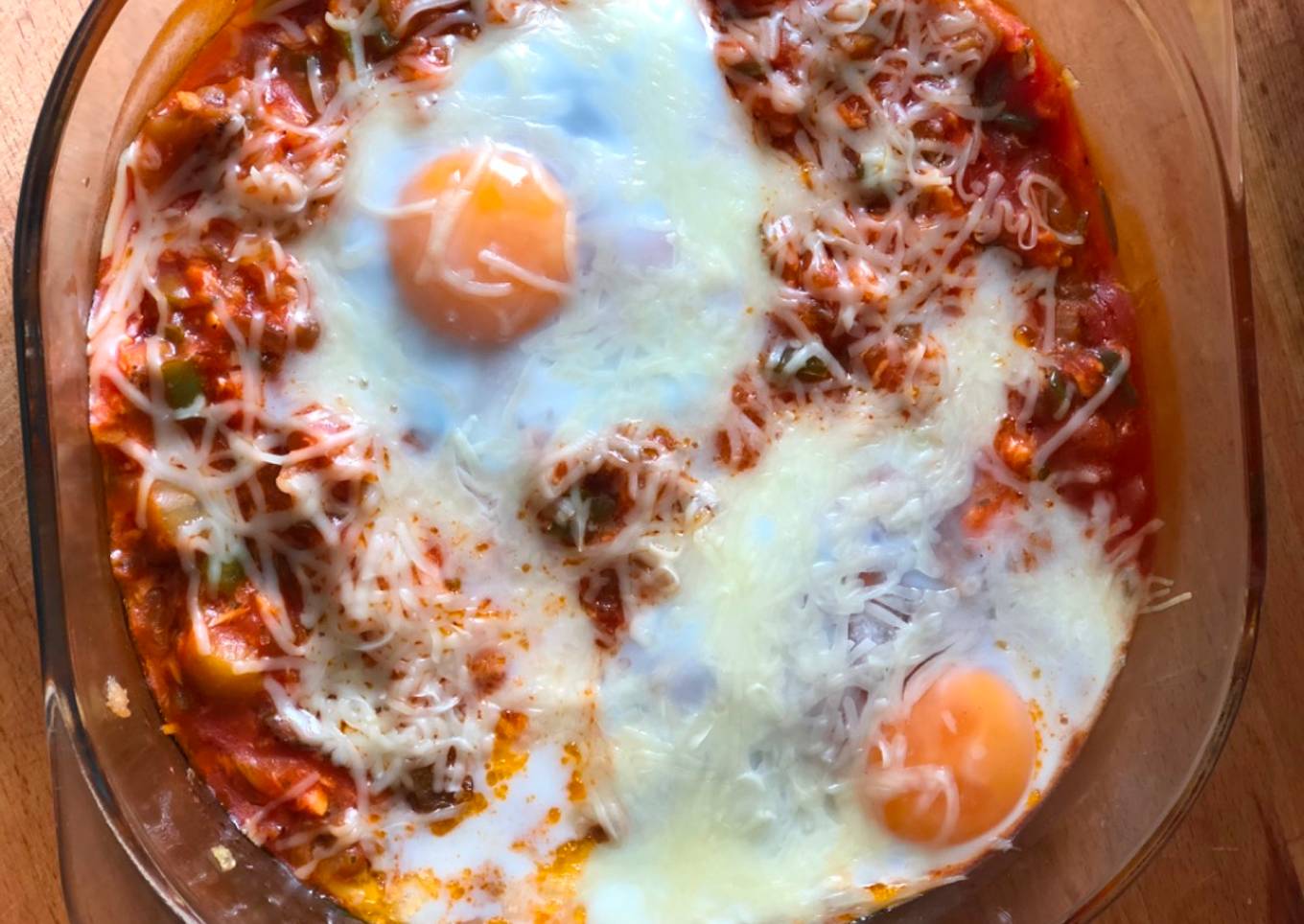 - Añadimos el atún y el tomate y lo ponemos en un recipiente apto para horno con los dos huevos arriba y queso rallado.