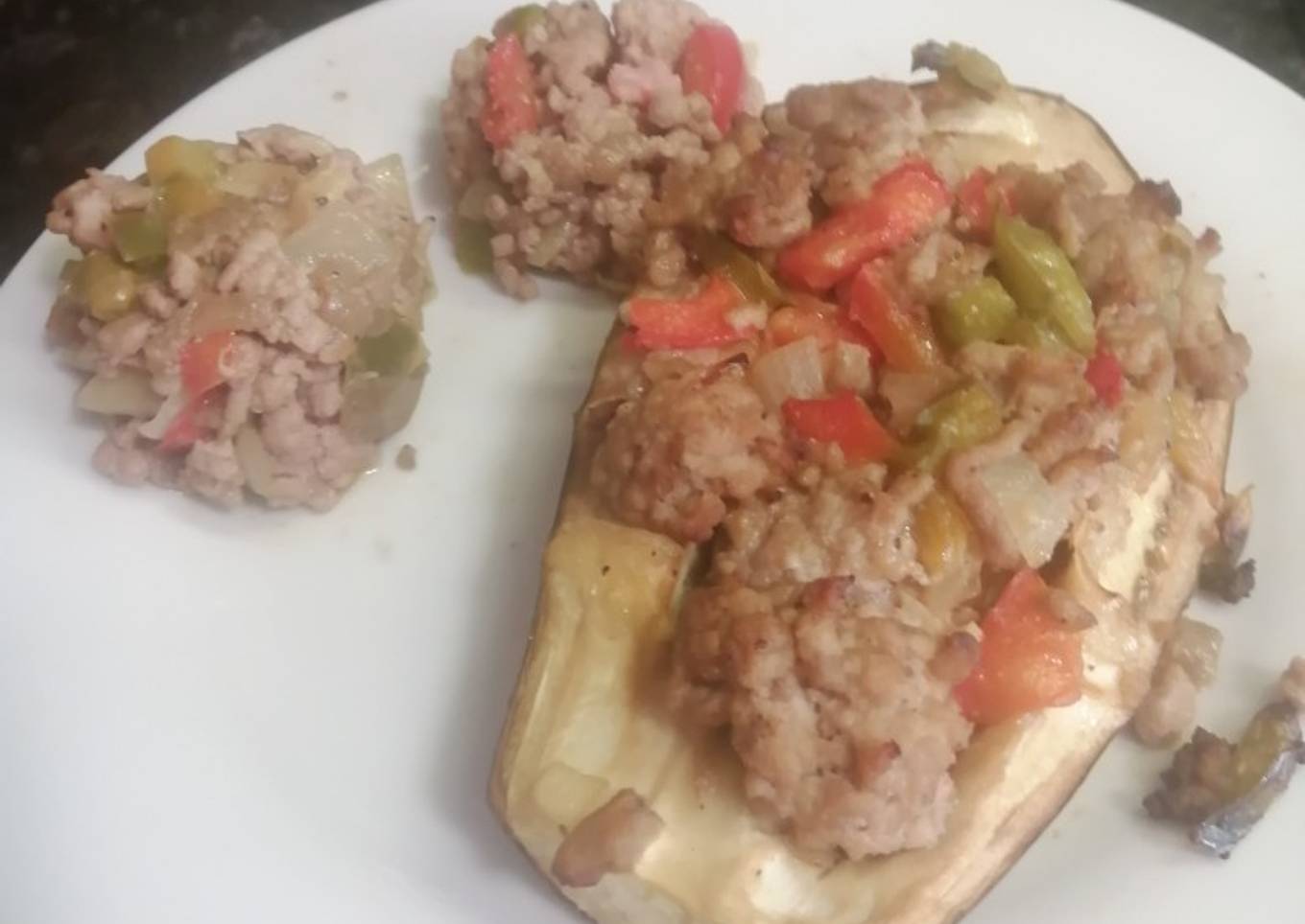 - Mientras tanto cortar la berenjena, quitarle la carne de dentro y picarla