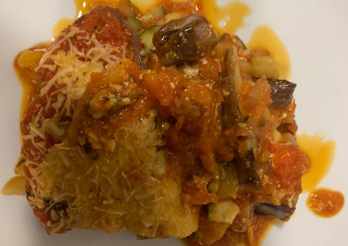- En una palangana para horno le ponemos una primera capa del tomate que hemos hecho, una capa de berenjenas, un poco de las verduras sofreídas, un poco del queso rallado y unas hojas de albahaca a trozos. Y repetimos, yo he hecho 3 capas, es decir, 2 pisos. Terminamos con salsa de tomate y queso. Lo ponemos al horno a 200 grados (precalentado) unos 20’.