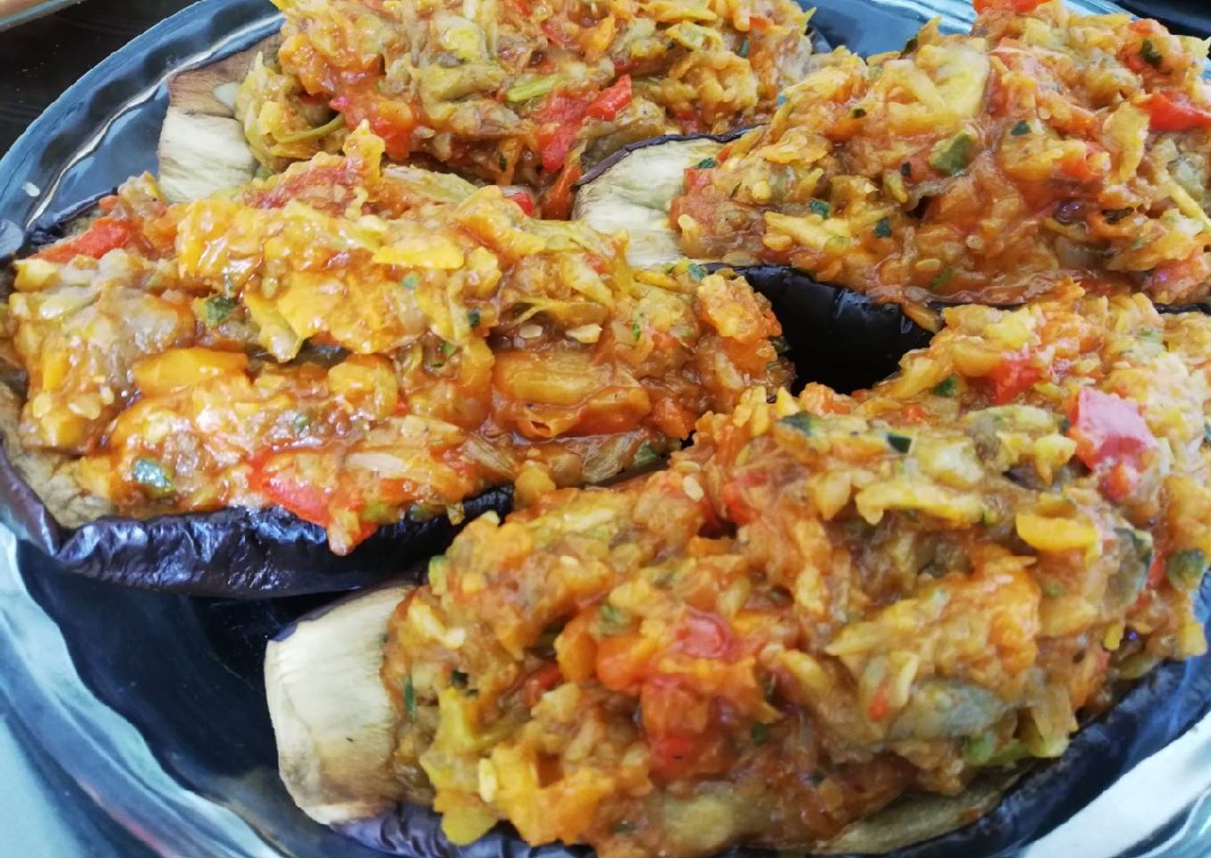 El relleno de estas berenjenas veganas lleva una variedad de coloridas verduras y condimentado orégano. La salsa de tomate casera está ideada para reunir a todas las verduras.