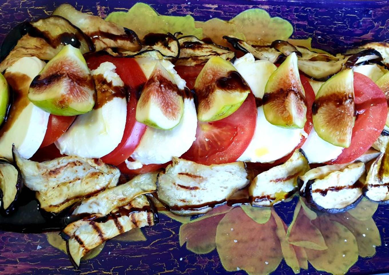 - En un plato monta la ensalada poniendo, rodajas alternas de tomate y mozzarella, a los lados la berenjena partida por la mitad y sobre esta los higos, aliña como más te guste y ¡¡ lista!!