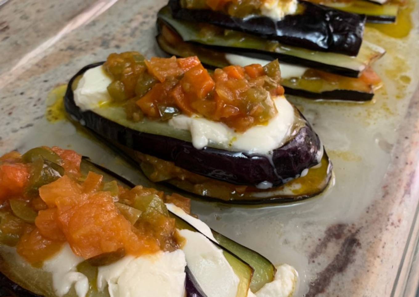 - Laminamos y rellenamos berenjena-sofrito-mozzarella fresca picada y así sucesivamente.