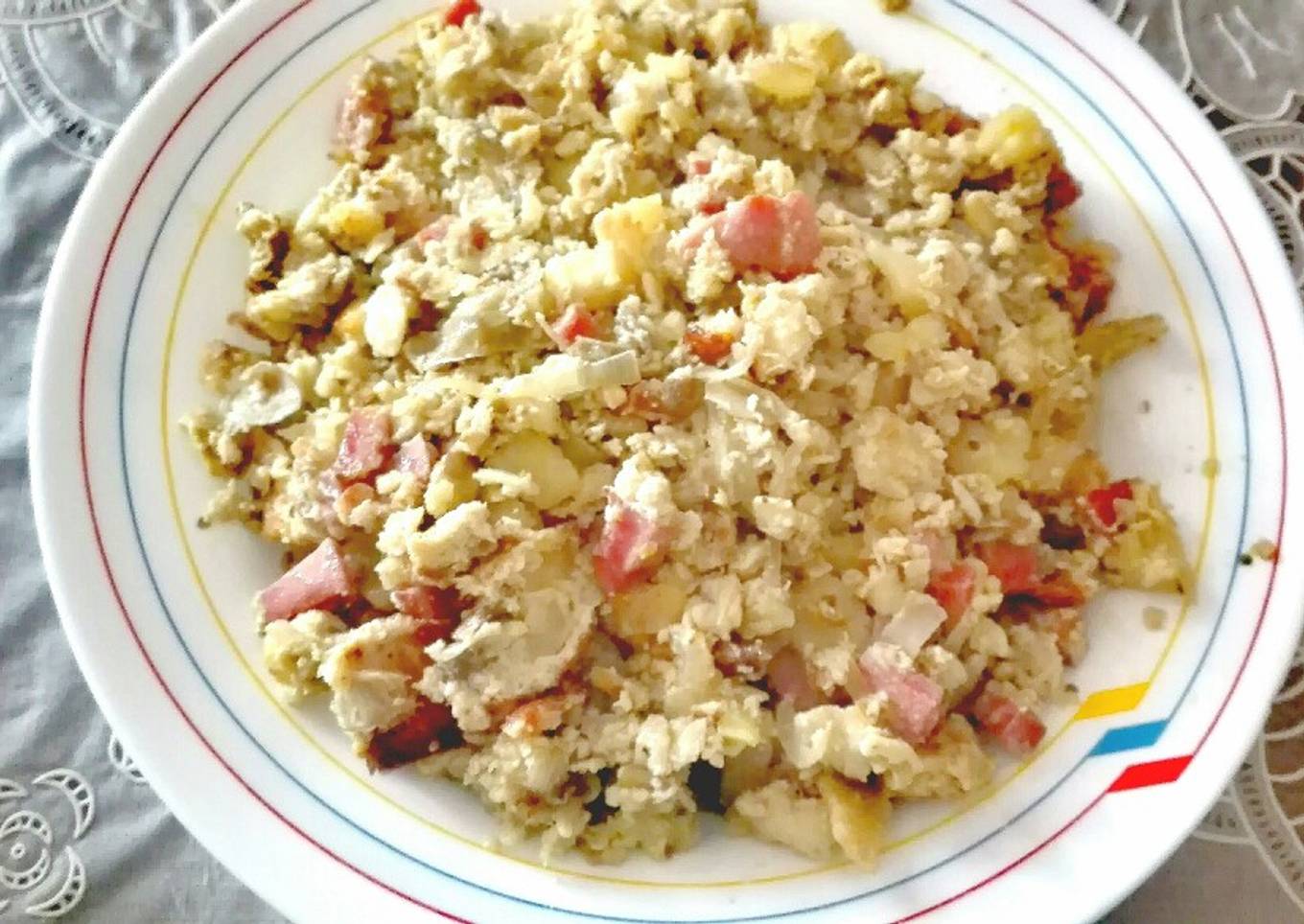 - Batimos los huevos y los mezclamos con los demás ingredientes. En una sartén con un poco de aceite, añadimos la mezcla y cocinamos el revuelto.