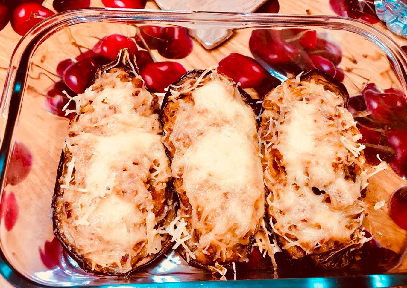 - Las medias berenjenas ya sin pulpa, las colocamos en una bandeja de horno, y reservamos.