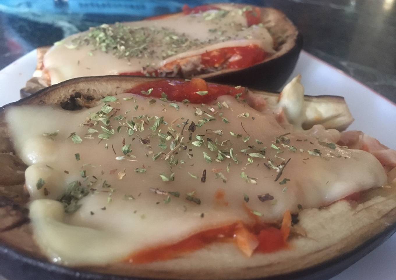 - Coloca el queso al gusto sobre la salsa e introduce las berenjenas de nuevo en el microondas en modo gratinado, si es posible, durante 1min o hasta que el queso se derrita un poco.