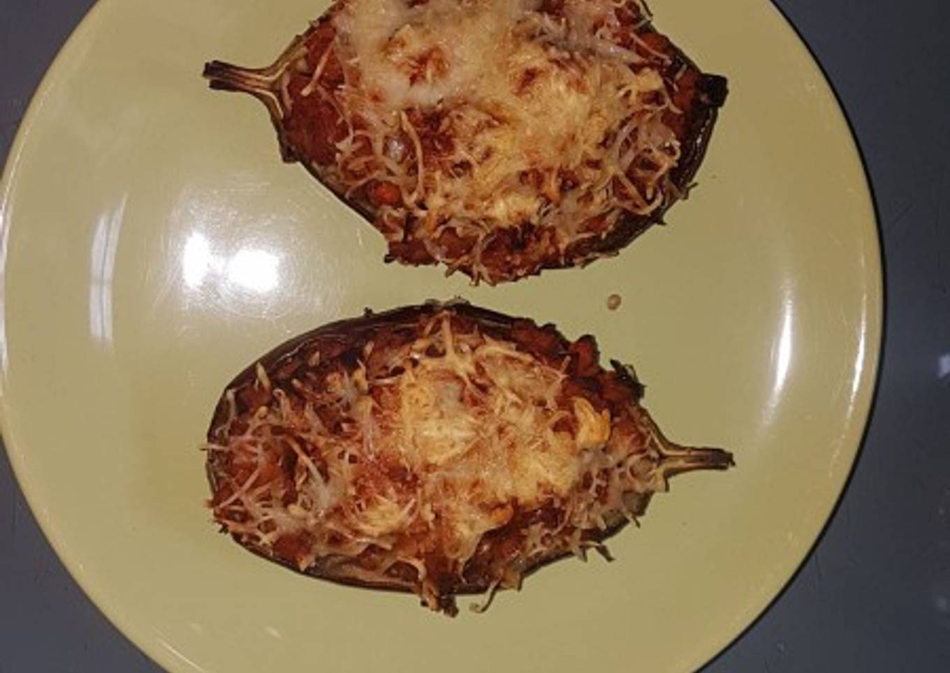 - Una vez listo el sofrito echamos toda la mezcla dentro de las berenjenas que hemos vaciado, llenandolas bien. Encima espolvoreamos un poquito de queso rallado. Y metemos al horno durante 15 minutos a 200 grados. Y listo!!