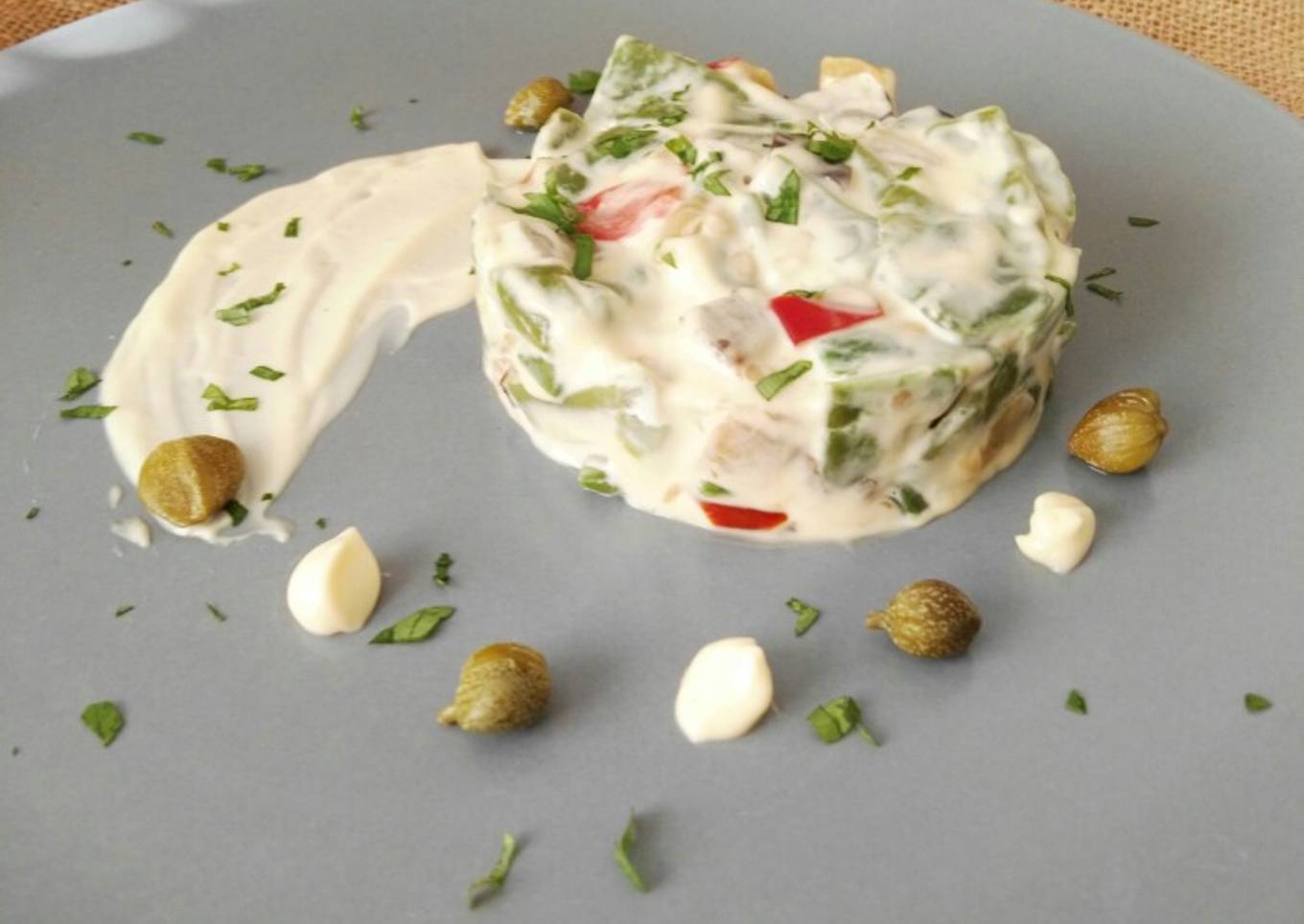 - Adornamos con la mahonesa reservada. Añadimos al gusto un poco de perejil fresco picado y algunas alcaparras