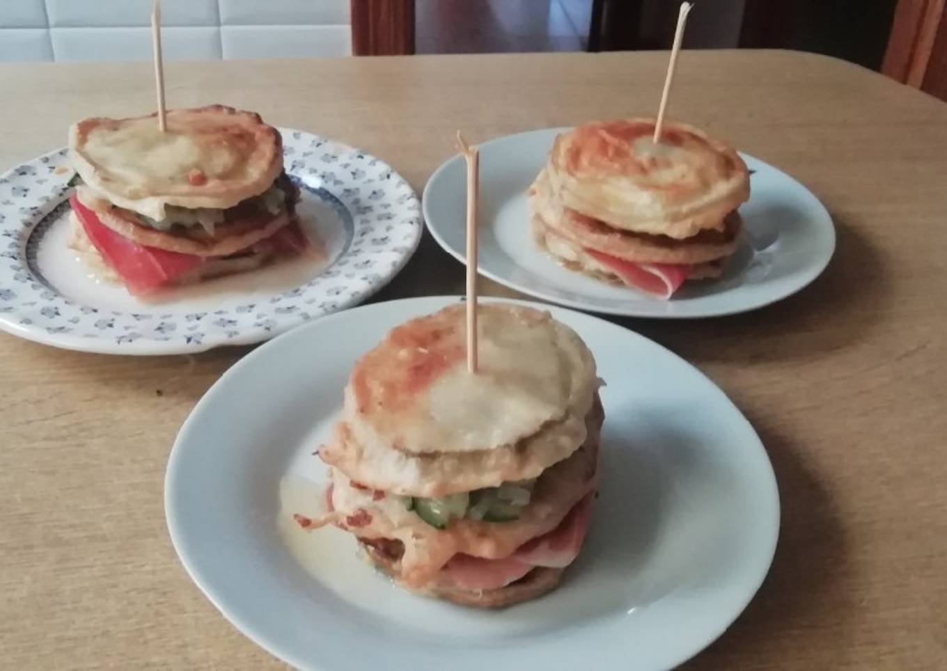 - Sobre la siguiente colocamos la loncha de jamón, encima el queso fresco y una gota de miel, en la siguiente loncha volvemos a poner verdura y terminamos con la rodaja que mejor aspecto tenga