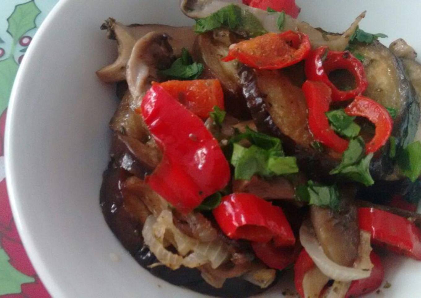 - Preparar la berenjena cortada en un pirex de cristal añadir un poco de aceite de oliva, poner sofrito de setas y pimiento rojo mezclar con especies provensales, pimienta negra y 1/2 vaso de Agua de Mar. Precalentar el horno a 180 º cocinar unos 20 minutos.