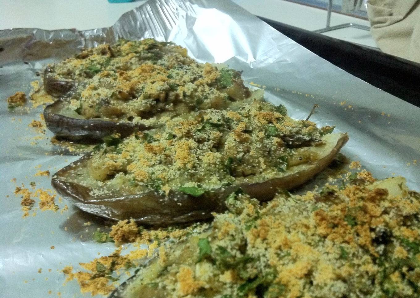 Cortamos el ajo y el perejil y lo mezclamos con el pan rallado. Espolvoreamos esta mezcla sobre las berenjenas.