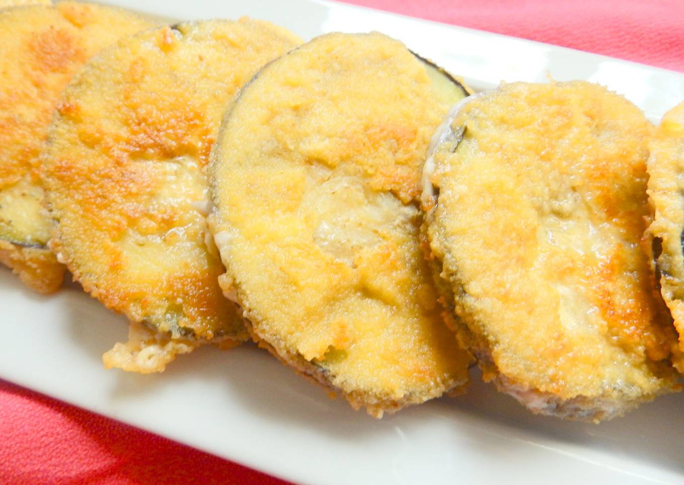 - Poner una cucharadita de queso, sobre una rodaja de berenjena; tapar con otra rodaja; y así de dos en dos, hasta terminar de emparejarlas todas... rebozar por este orden, con harina, huevo batido y pan rallado...