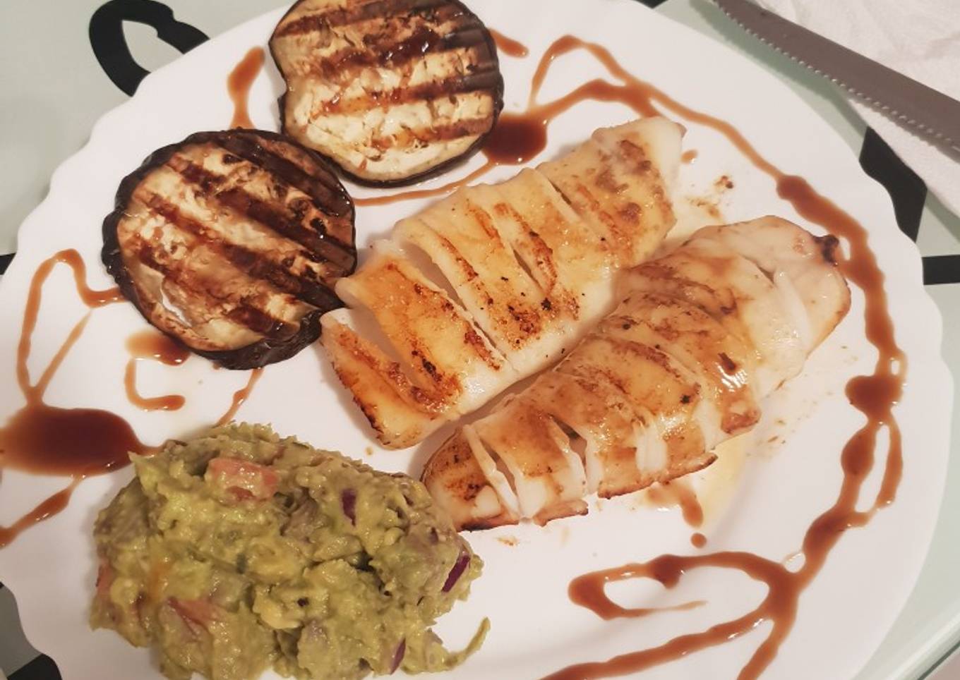 Calamares y berenjena a la plancha con guacamole acompañamiento
