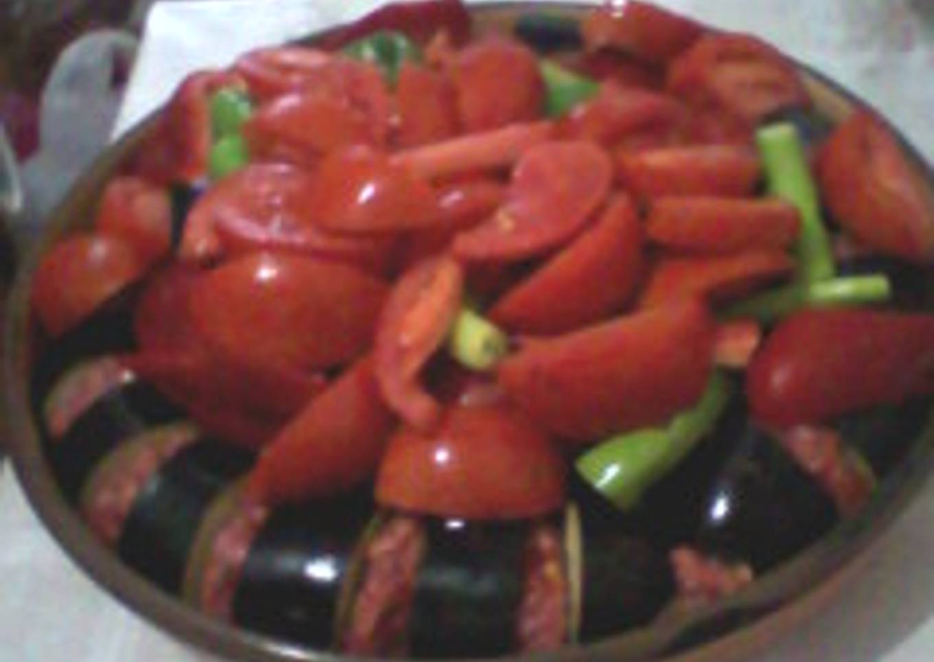 - En una bandeja de horno redonda, si puede ser, queda mas decorativo, ir poniendo una rodaja de berenjena un poco de carne picada y así sucesivamente hasta redondear la bandeja