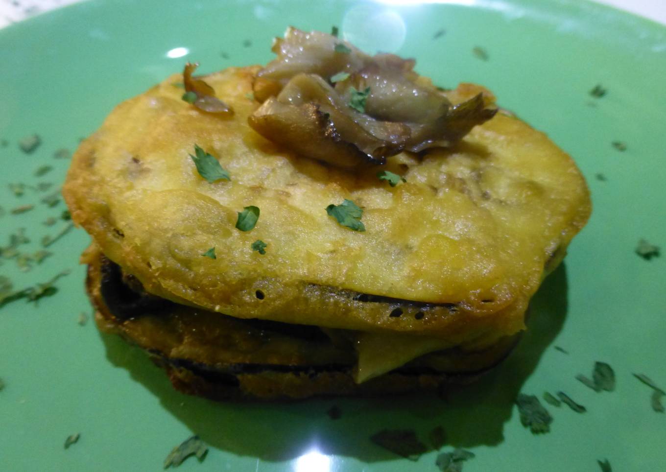 Mil hojas de berenjena en crujiente de tempura con un variado setas ya que ahora en otoño es la temporada, en este caso son, boletus de chopo y de cardo una delicia de plato.