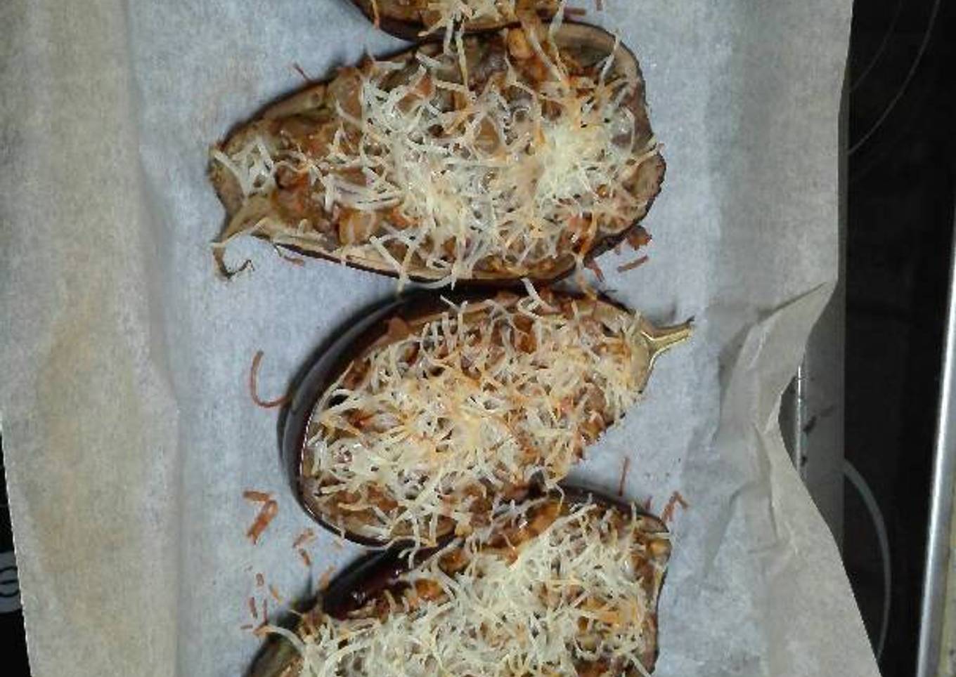 - Rellenamos las berenjenas y las metemos al horno a la misma temperatura con queso rallado por encima.