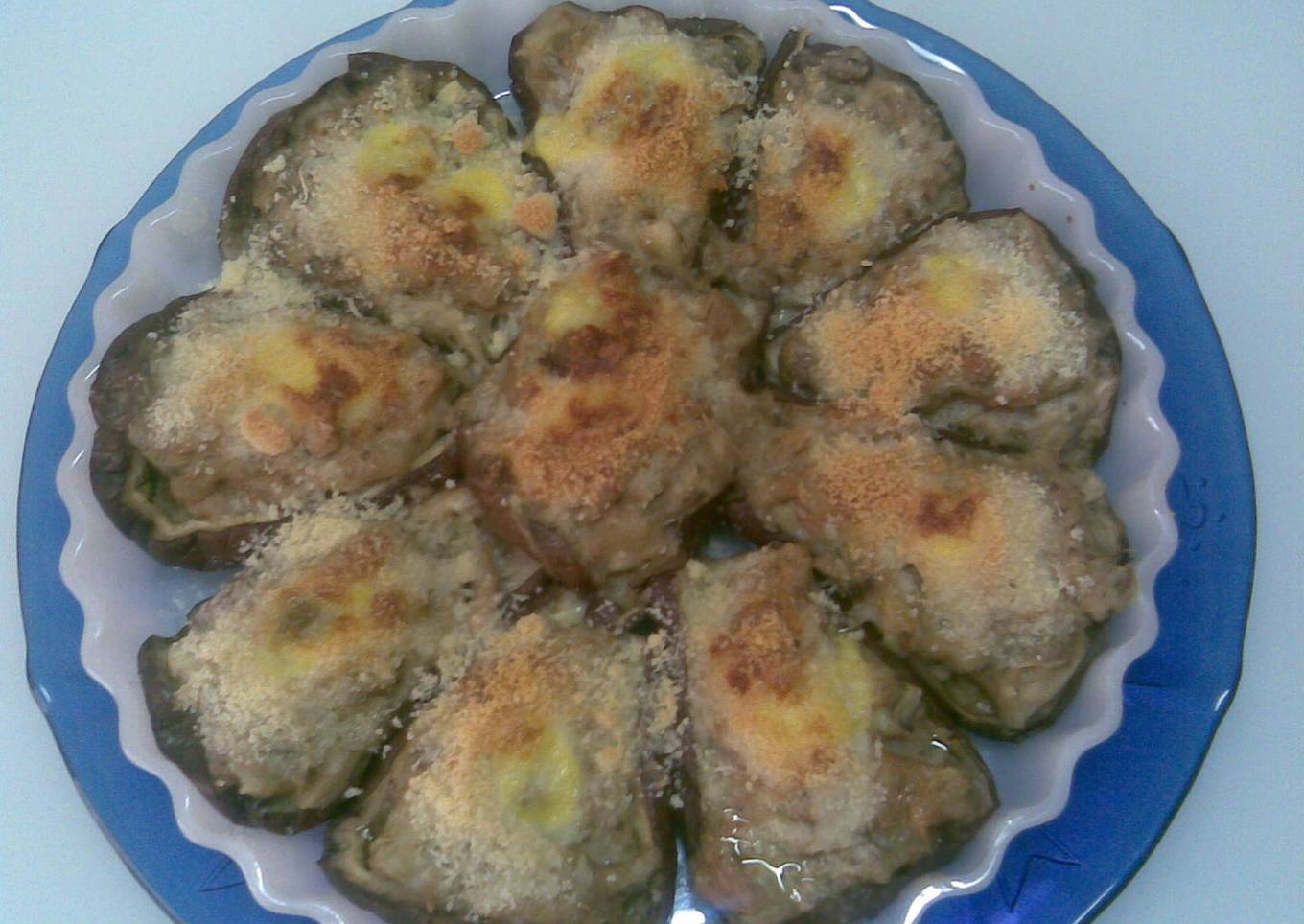 Berenjenas rellenas con atún y salsa bechamel, con queso rallado gratinado, deliciosas. La perdición de mis hijos y todos los que se apuntan.