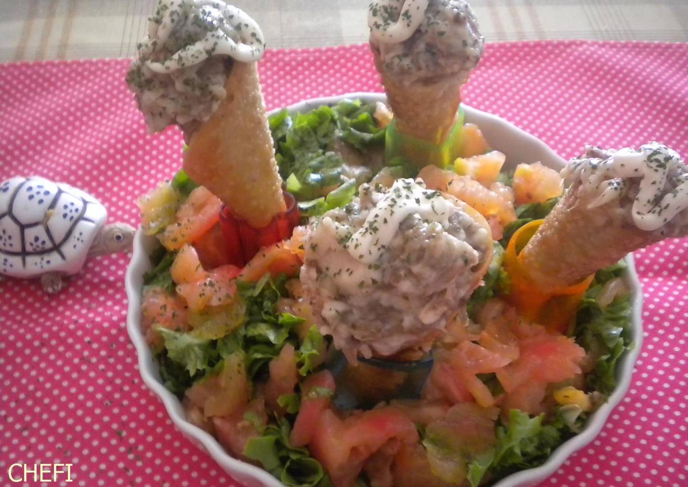 - Metemos a la nevera para que se compacte, una vez frío rellenamos los conos fritos, y decoramos con mayonesa.