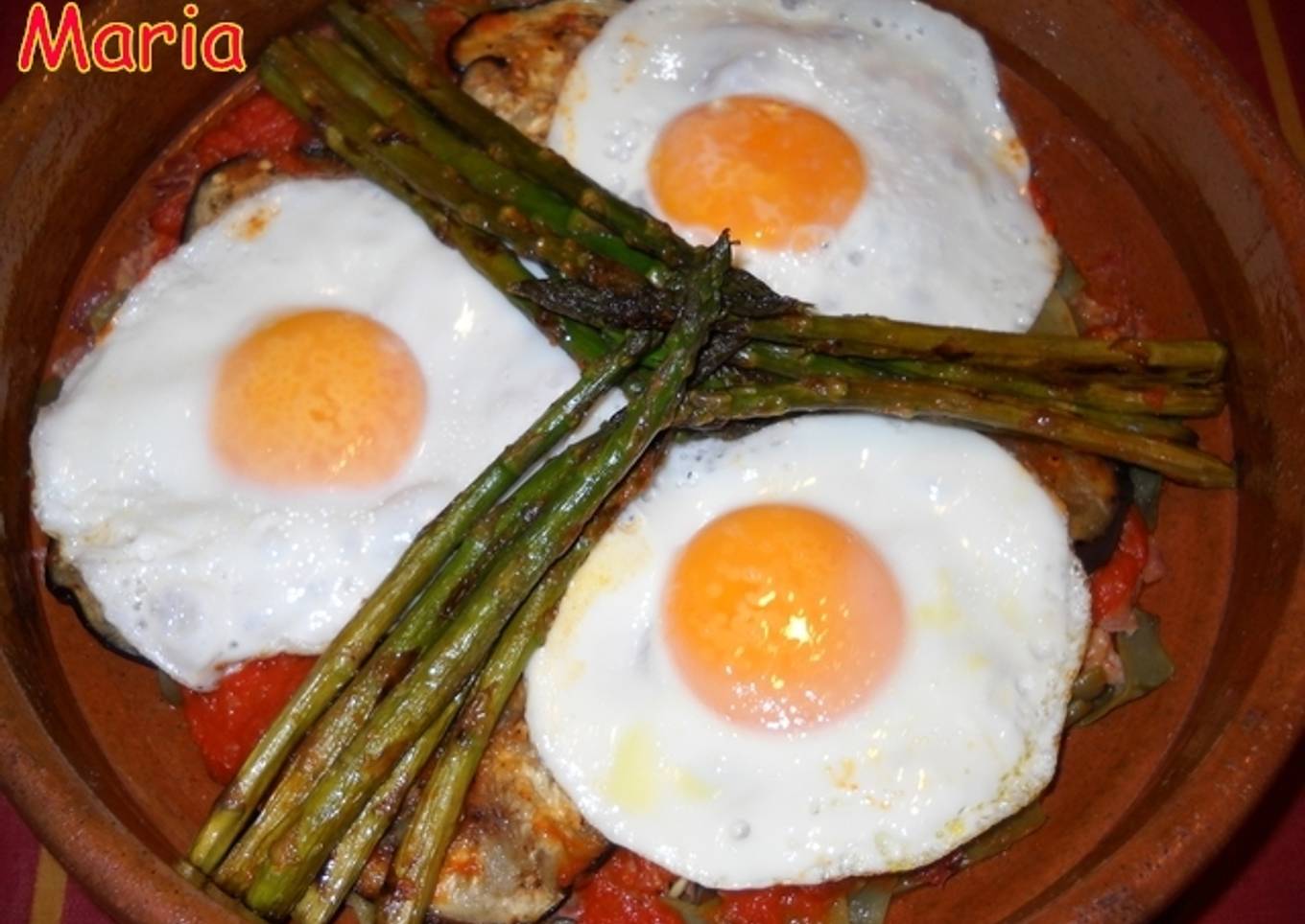 - En una cazuela de barro disponemos la verdura, la salsa de tomate, la berenjena y los espárragos y la ponemos a fuego suave para que se mantenga todo caliente.