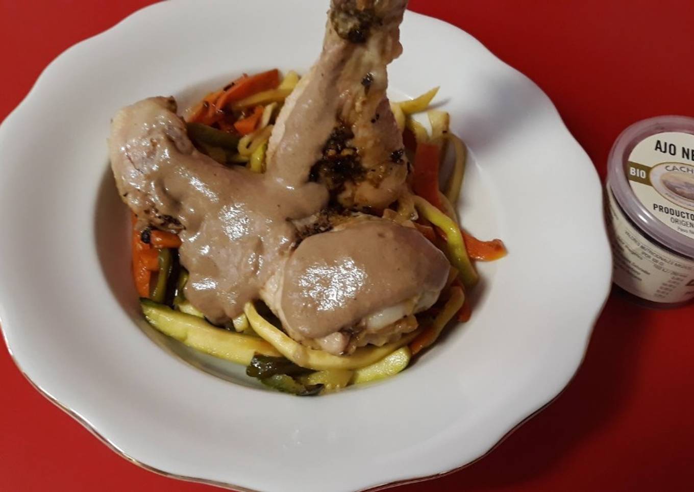 Pollo con salsa de ajo negro y verduras