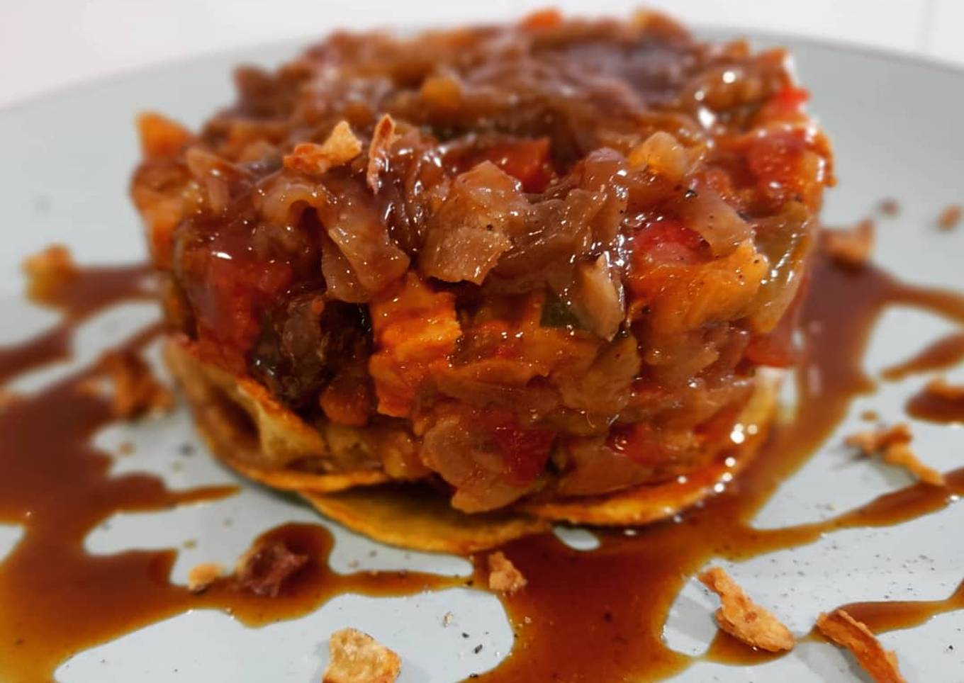 - Cogemos un aro metálico, ponemos una base de patatas salpimentadas, encima una de pisto y presionamos. Acabamos con la reducción por encima. Yo he añadido un punto crunchi añadiendo cebolla crujiente.