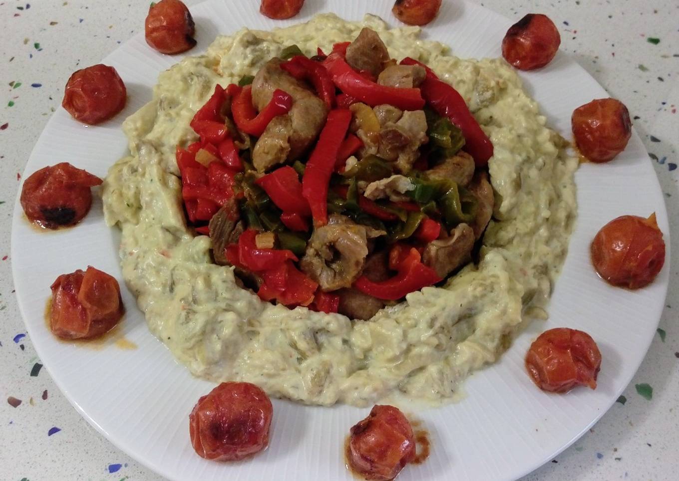 Secreto ibérico salteado con pimientos y crema de berenjenas con queso